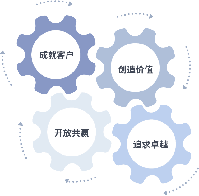 成就客户是一切决策的出发点,,,,创造价值是衡量所有工作的标准,,,追求卓越是我们做事做人的态度,,,,开放共赢是我们的格局也是最终的结果。。价值观的齿轮环环相扣,,推动着组织里的每个人不断向前。。。