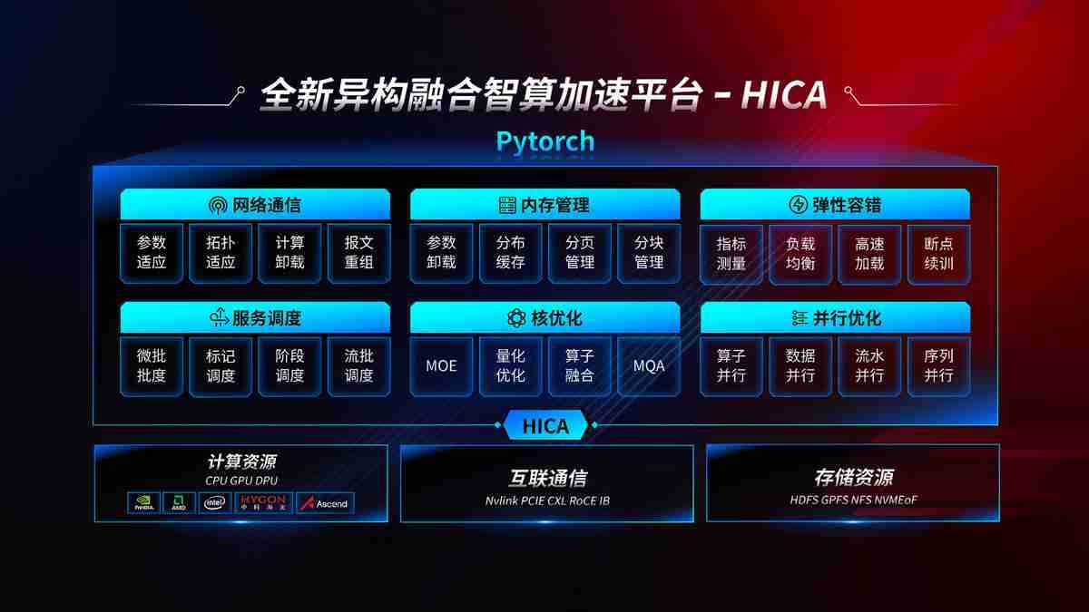 通过自研的服务层、、、中间适配层、、、以及调度编排算法,,,,采用数据并行、、、、模型并行等多种并行方式,,把并行计算任务进行有效的分解,,,,使其分别由相应的软件栈和算力资源来承接。。。。当GPU资源变化,,HICA可以实时动态调度计算子任务并调整模型拓扑和架构,,,以充分聚合各种算力资源。。。