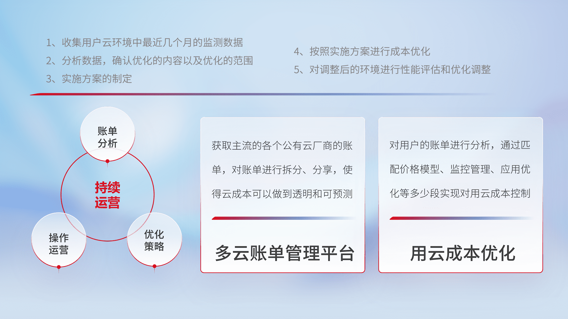 通过多云纳管,,,以统一的资源数据模型把客户的云资源进行抽象和封装,,进而实现对多云资源的统一操作,,保障云资源管理的可靠性、、、、稳定性与可用性。。。量身定制化运维内容,,,,配置、、、、开发运维、、、、补丁管理、、、、备份、、、监控、、、认证和访问管理、、审计和日常巡检等,,,,保障在用云过程中的可靠度,,,稳定度以及高可用率。。。